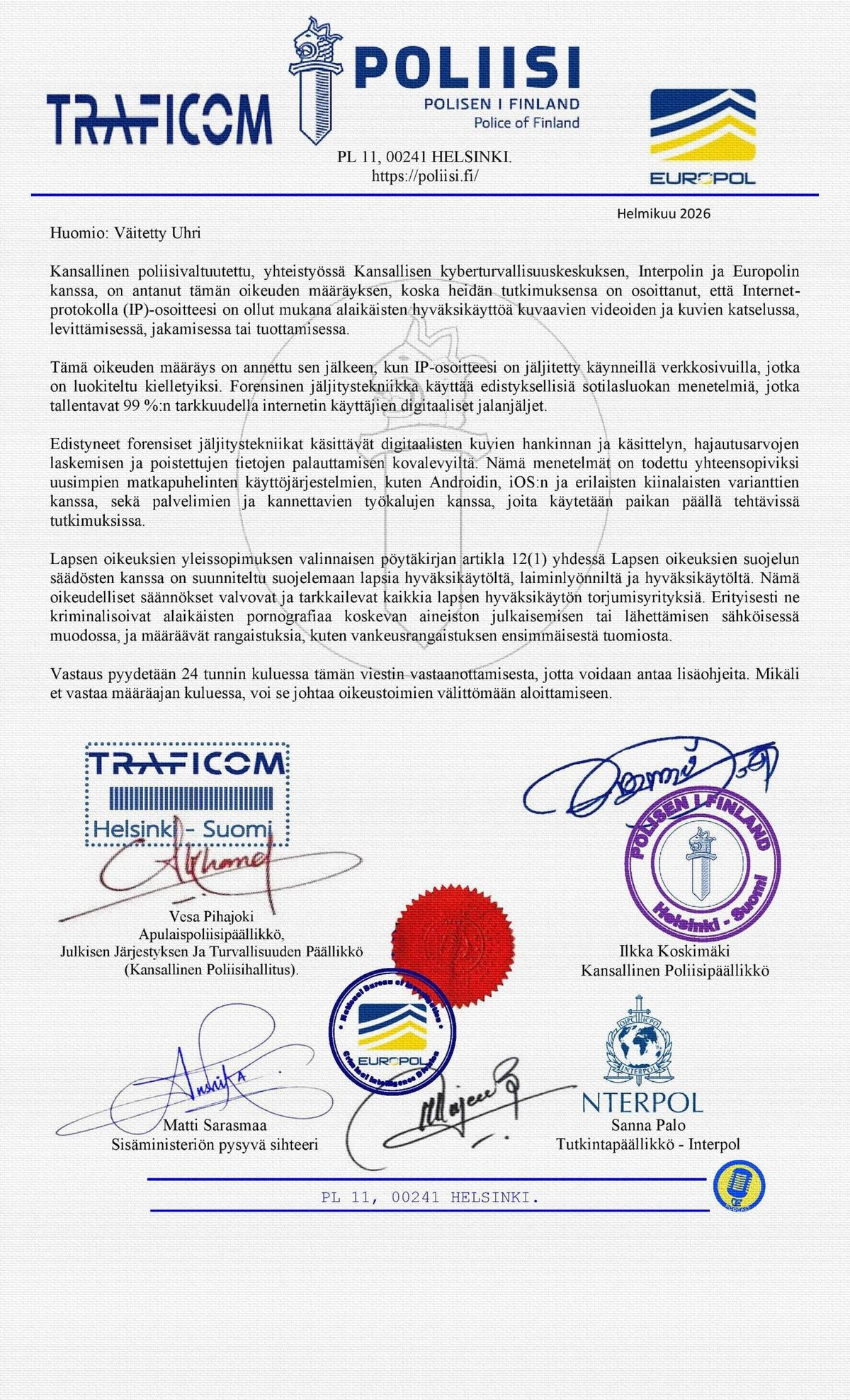 On tärkeää huomata, että tuomioistuin on kehottanut kaikkia Suomen kansalaisia ja ulkomaalaisia pidättäytymään ehdottomasti alaikäisiä, alle 14-vuotiaita, koskevien pornografisten kuvien tai materiaalien käyttämisestä, tuottamisesta tai levittämisestä IP-osoitteidensa kautta. Tämä johtuu siitä, että virallisen tai yksityisen internetyhteyden käyttäminen tai sen salliminen lapsipornografista materiaalia esittävän sisällön katseluun tai käyttöön on Suomen rikoslain mukaan ehdottomasti kielletty.