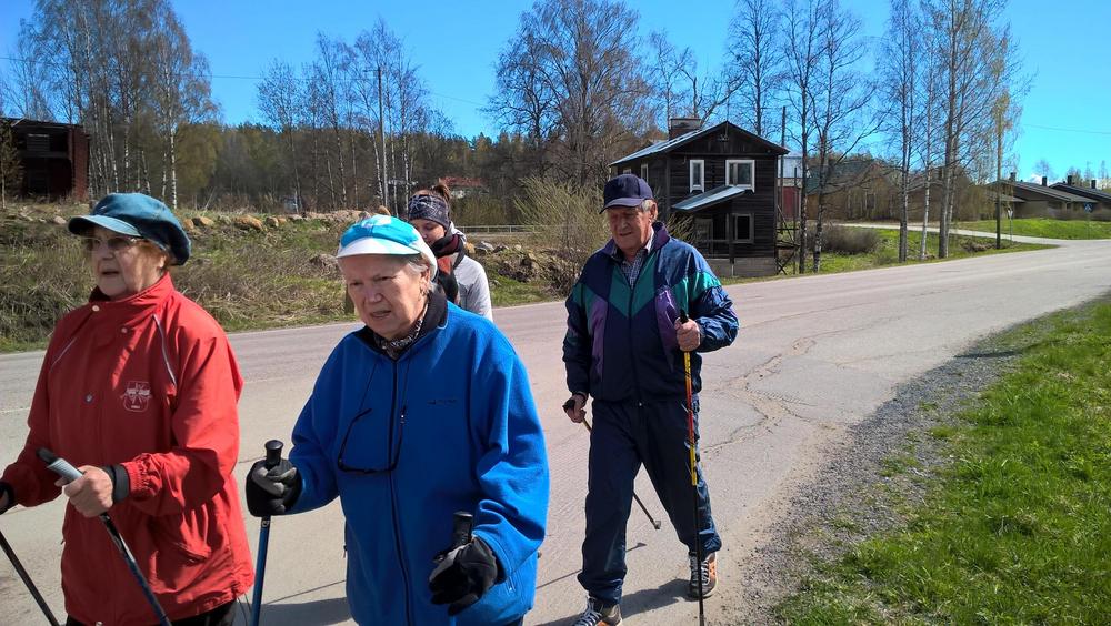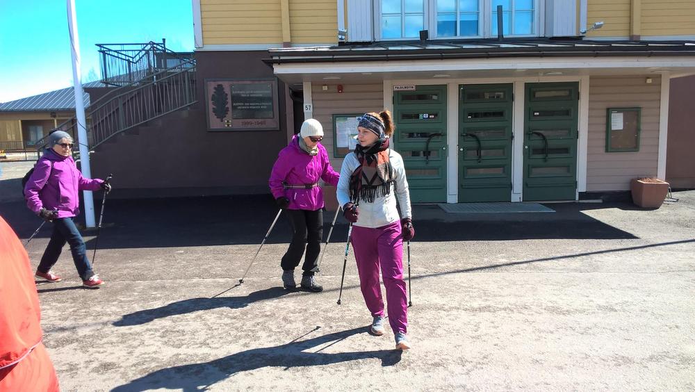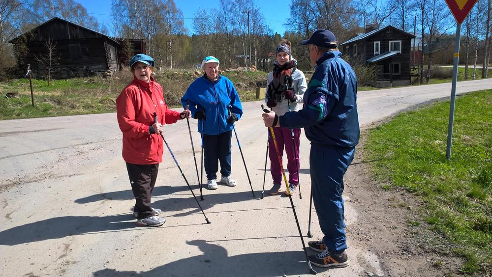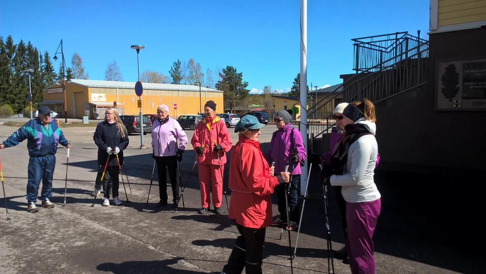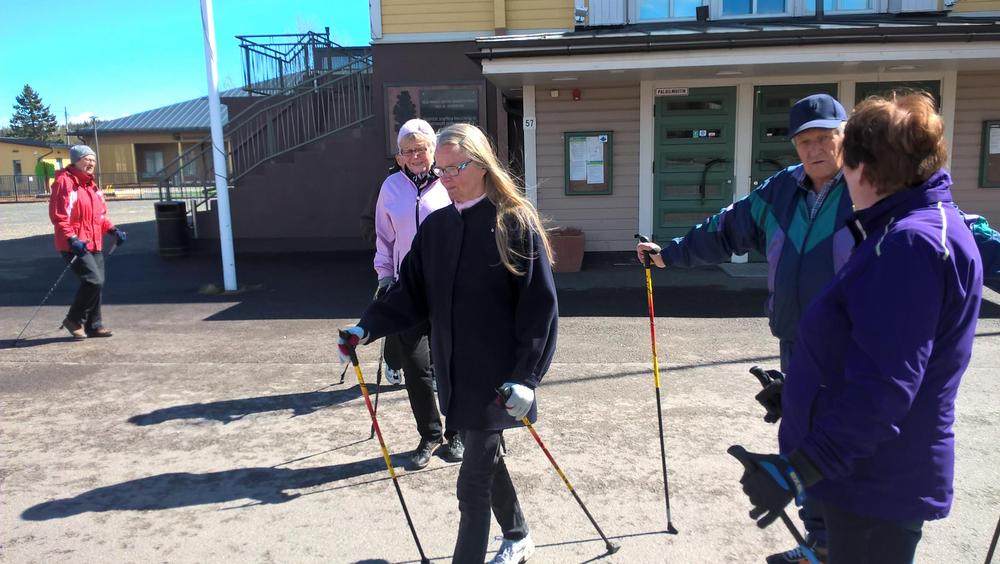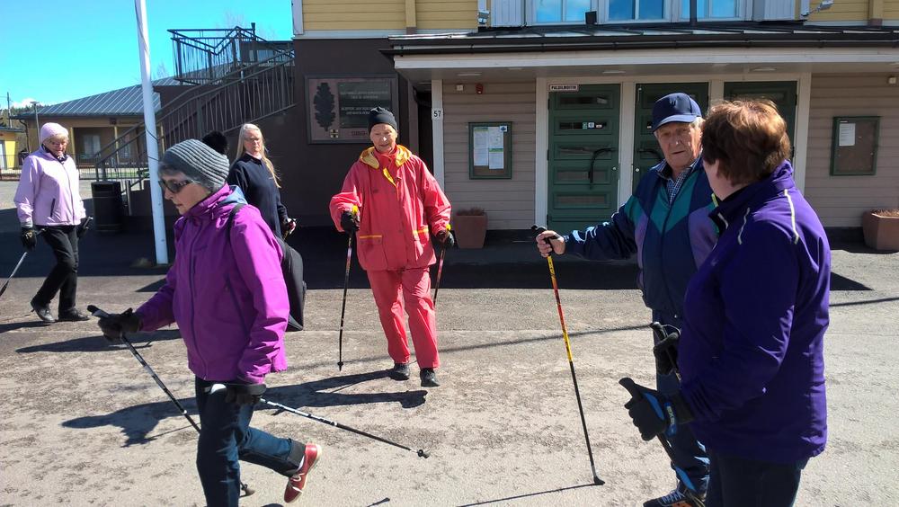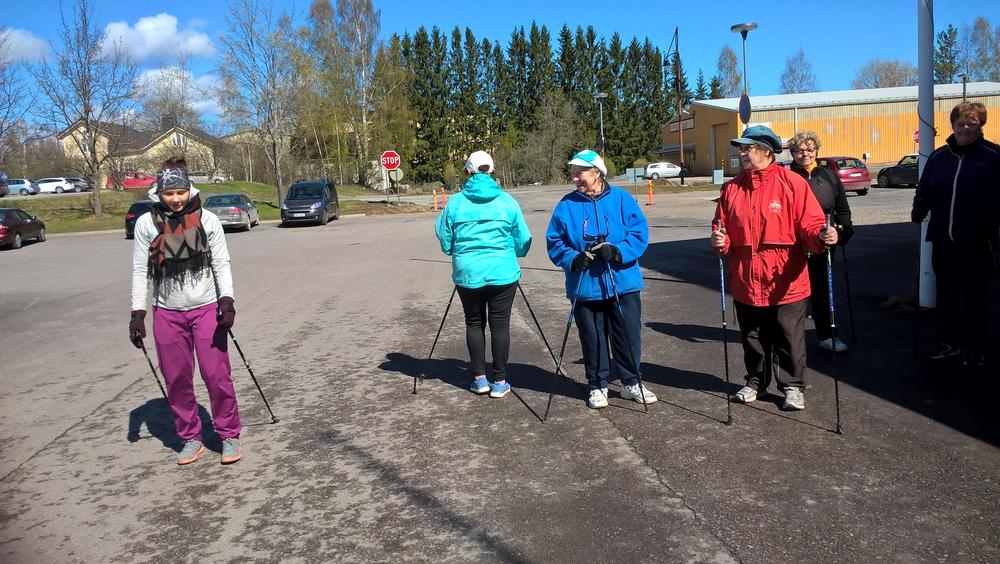 Kuhmoisten vt. liikunnanohjaaja Anni Manneri opasti senioreita asiantuntevasti oikeiden välineiden hankintaan ja sauvakävelytekniikkaan. Paikalla oli lukuisa määrä Senioreita.