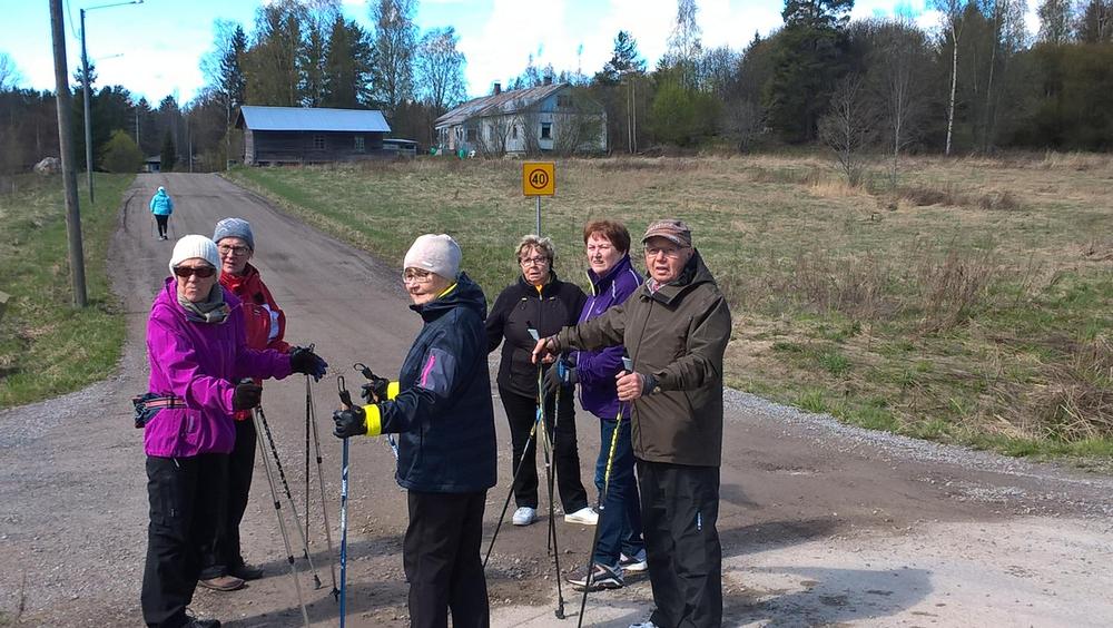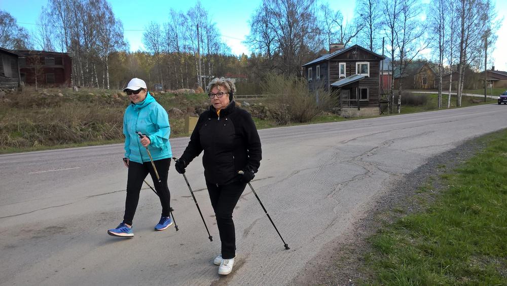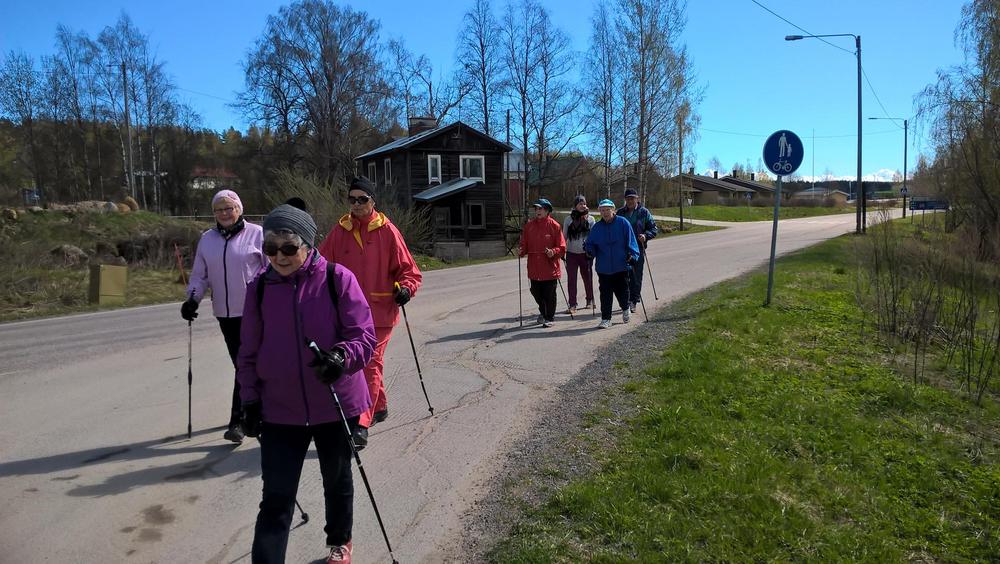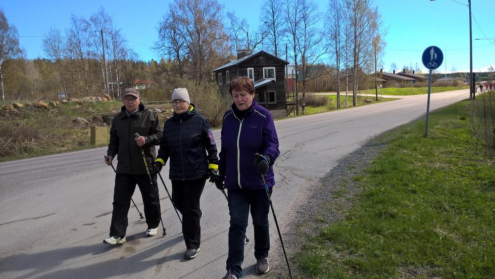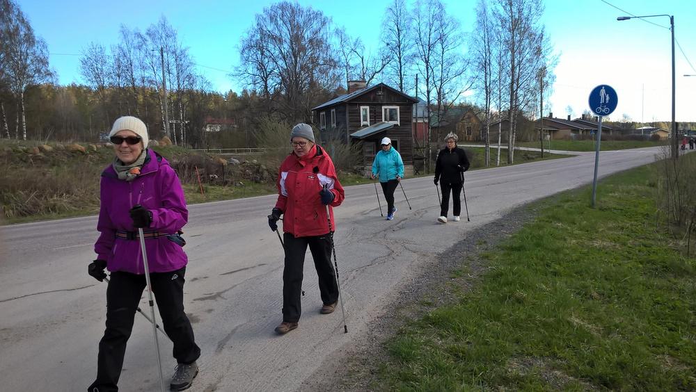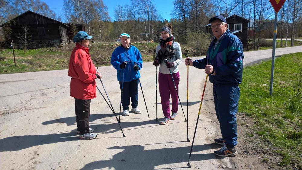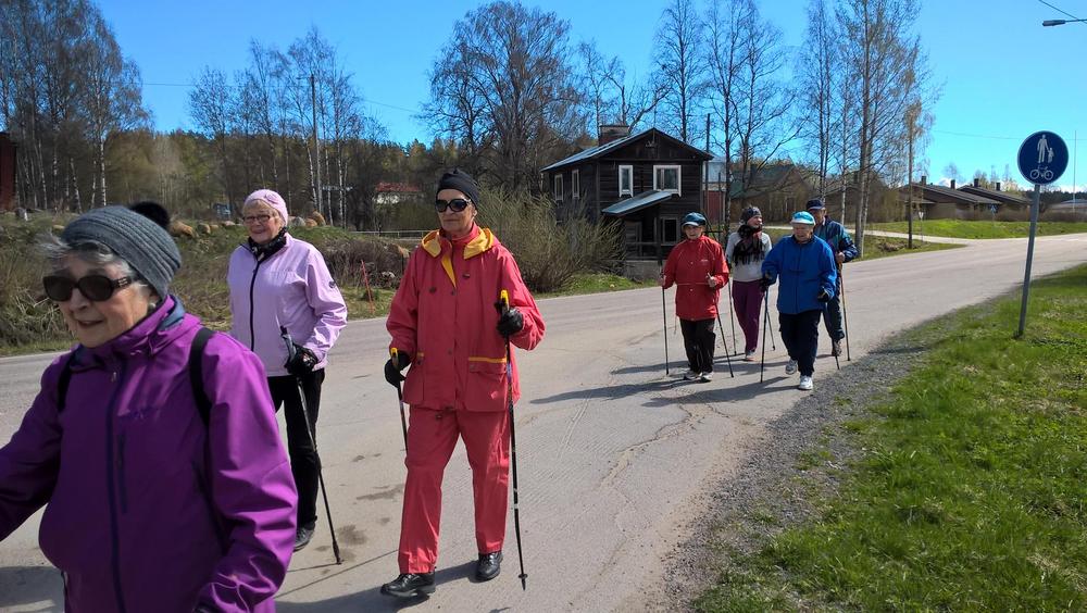Kuhmoisten vt. liikunnanohjaaja Anni Manneri opasti senioreita asiantuntevasti oikeiden välineiden hankintaan ja sauvakävelytekniikkaan. Paikalla oli lukuisa määrä Senioreita.