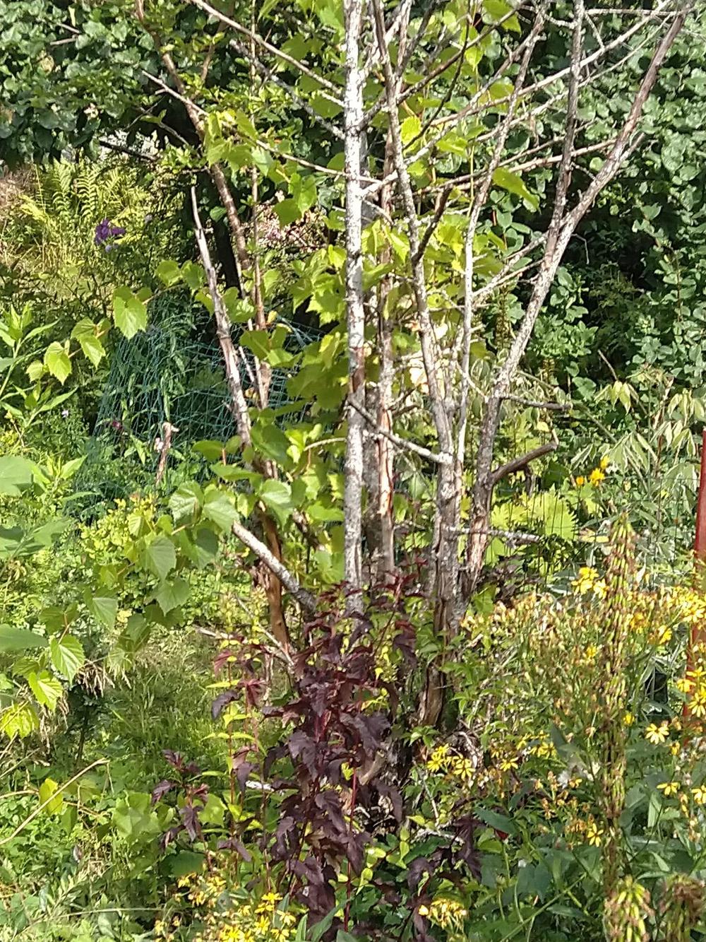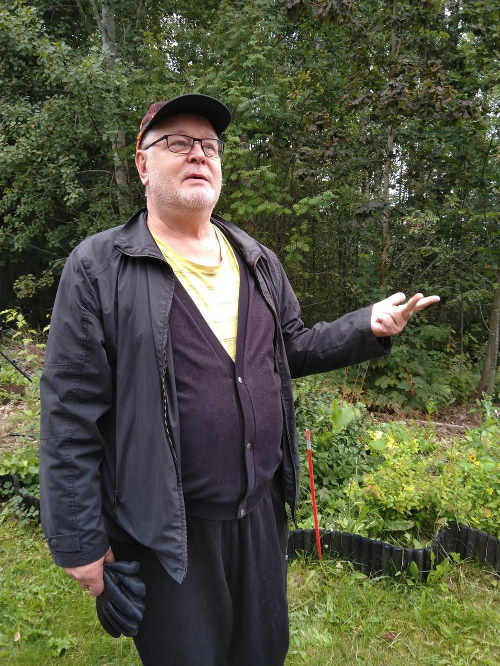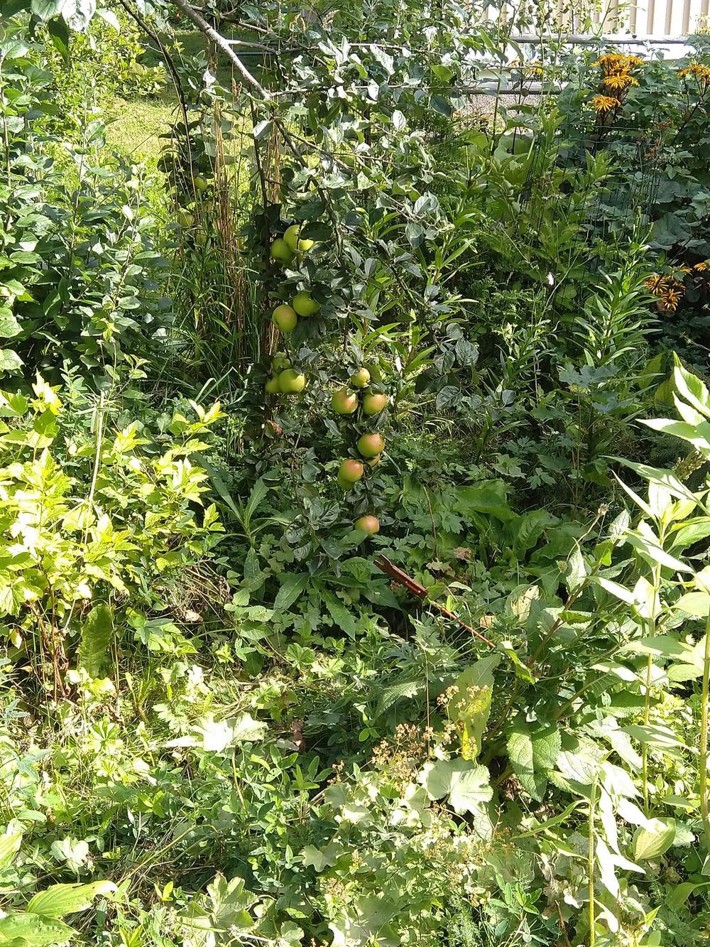 Kaikkien kasvien nimet eivät jääneet mieleen mutta se periaate että nurmikkoa ei ole ja kasvit täyttävät koko puutarhan. Runsaasti kukkivia perennoita, pensaita, puita joiden välissä polkuja. Perhoset, hyönteiset, sammakot viihtyvät. Sekä talon asukkaat tietysti. Vierailijoille riittää kertomuksia. Kuivahtanut puu toimii nyt köynnöskasvin tukena esimerkiksi. Cottage Garden!