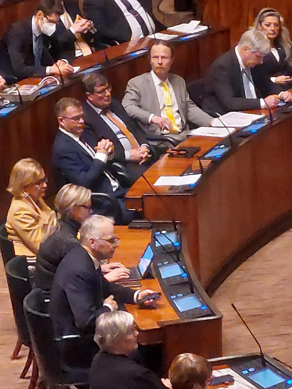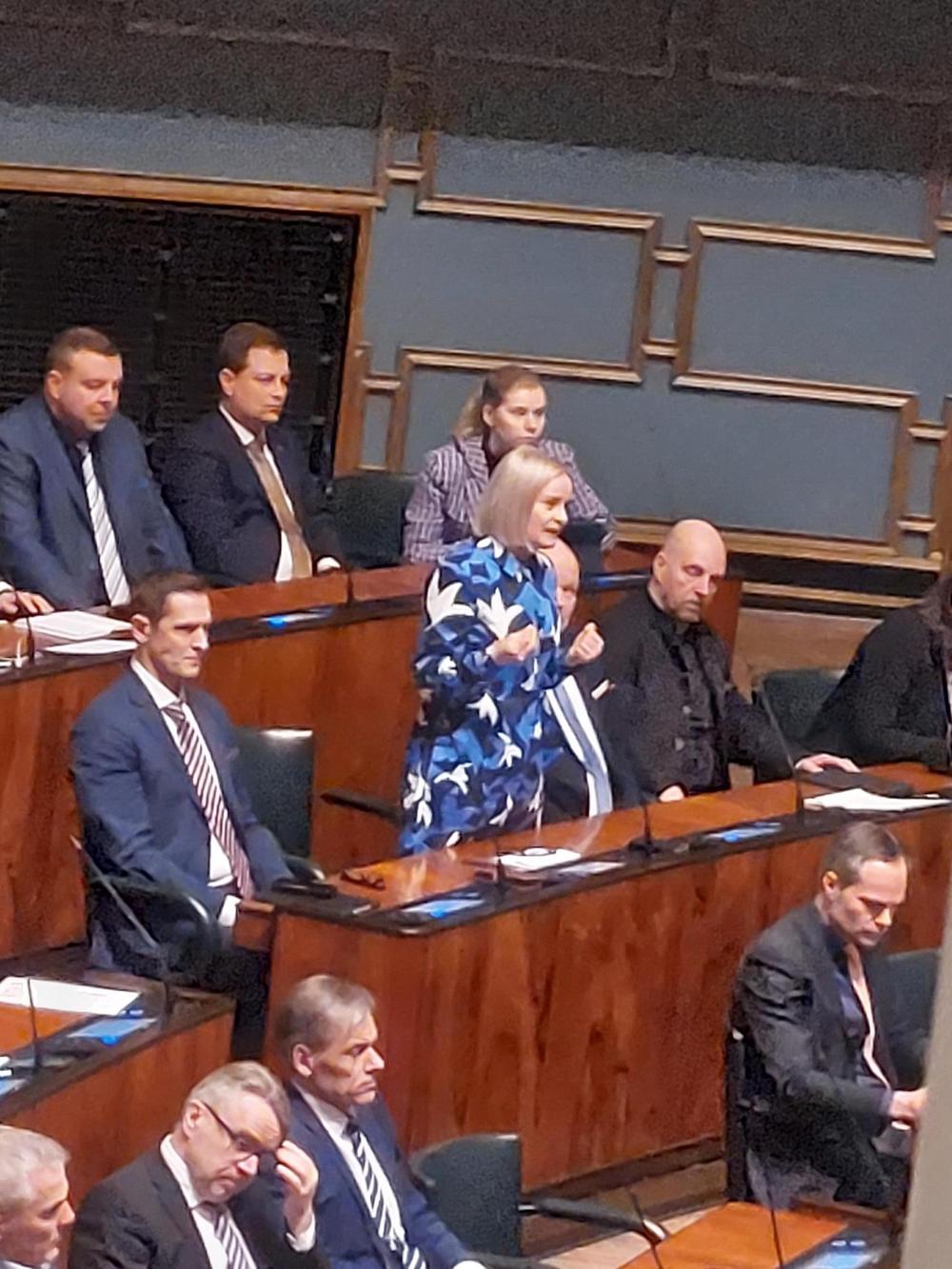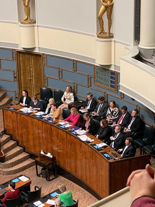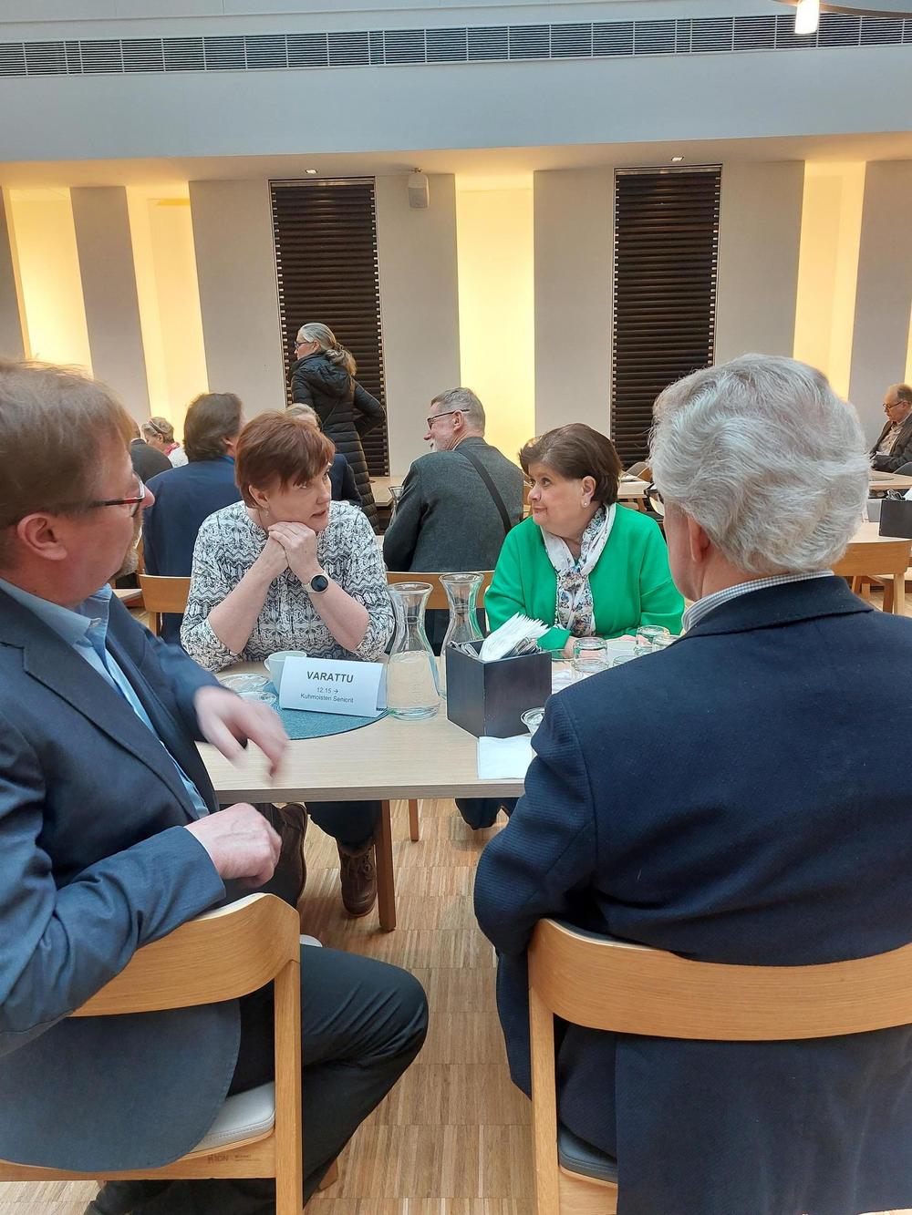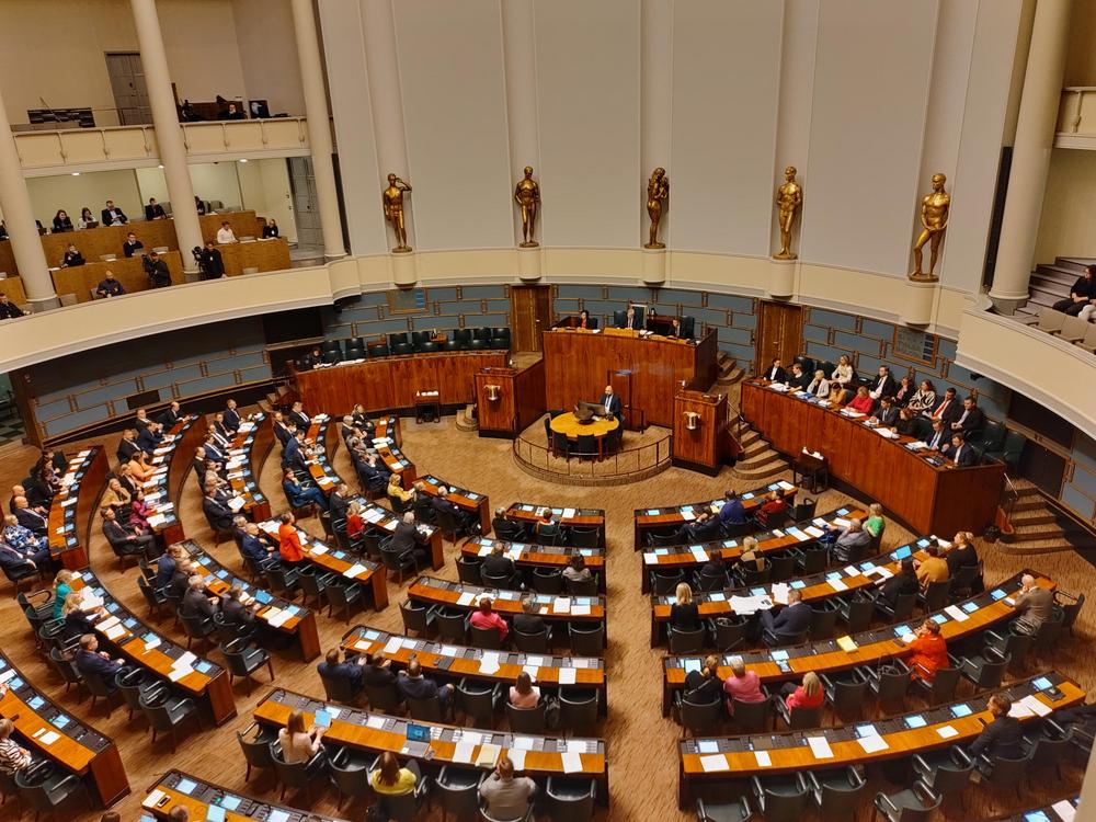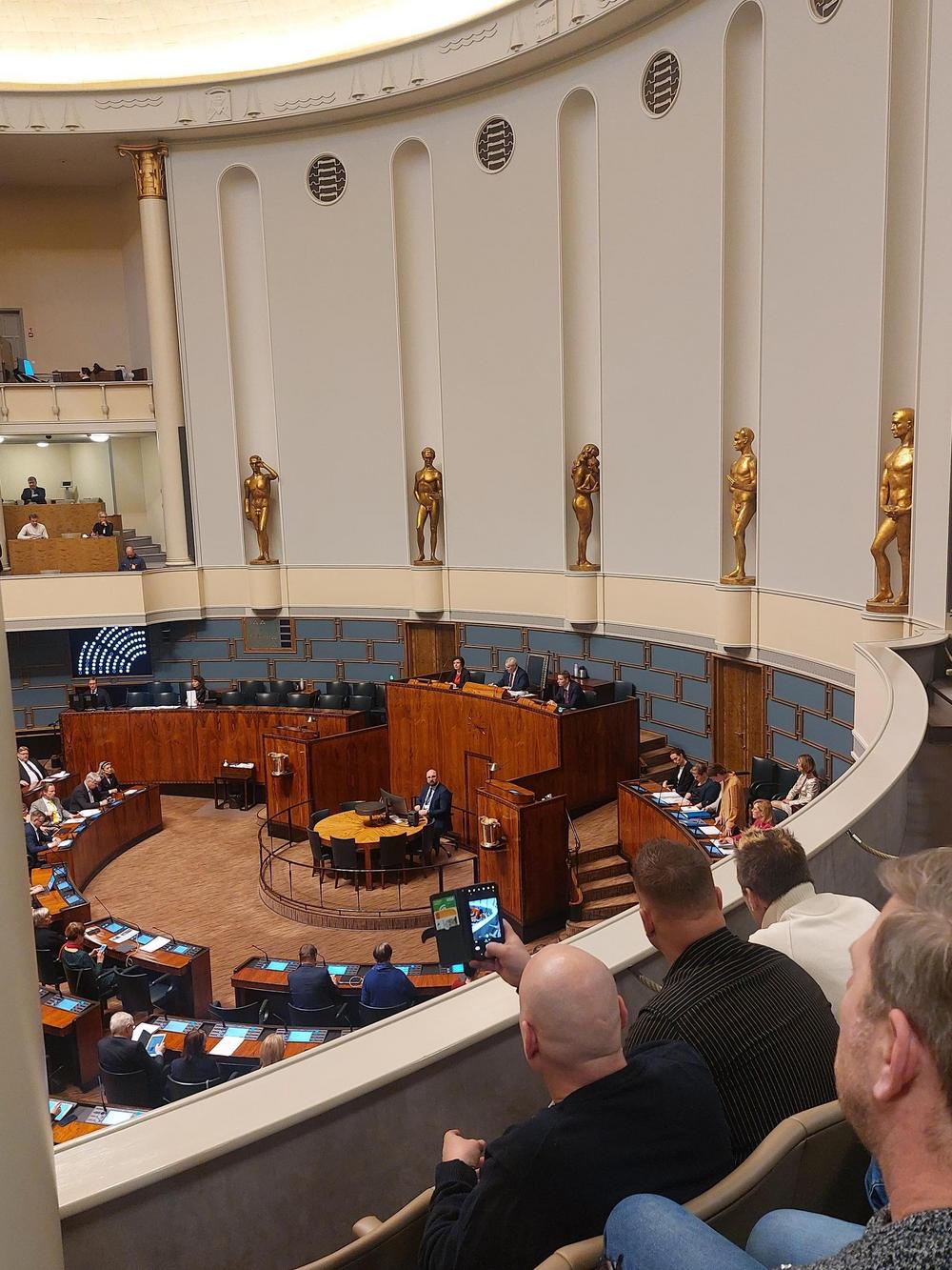 Kokoonnuimme jälleen yhteen Eduskuntatalon B ovelle 15:30, jolloin pääsimme sisälle turvatarkastukseen. Läpivalaistuksen jälkeen nousimme portaita pitkin eduskunnan lehterille kuuntelemaan kyselytuntia. Tämän jälkeen Kuhmoisten Senioreiden vierailun kutsujana toiminut Arto Satonen johdatti meidät kokoustilaan missä tarjoiltiin pullakahvit ja kävimme keskusteluja ja teimme isäntämme johdattamana pienen kierroksen eduskuntatalossa ja kuulimme sen historiaa.