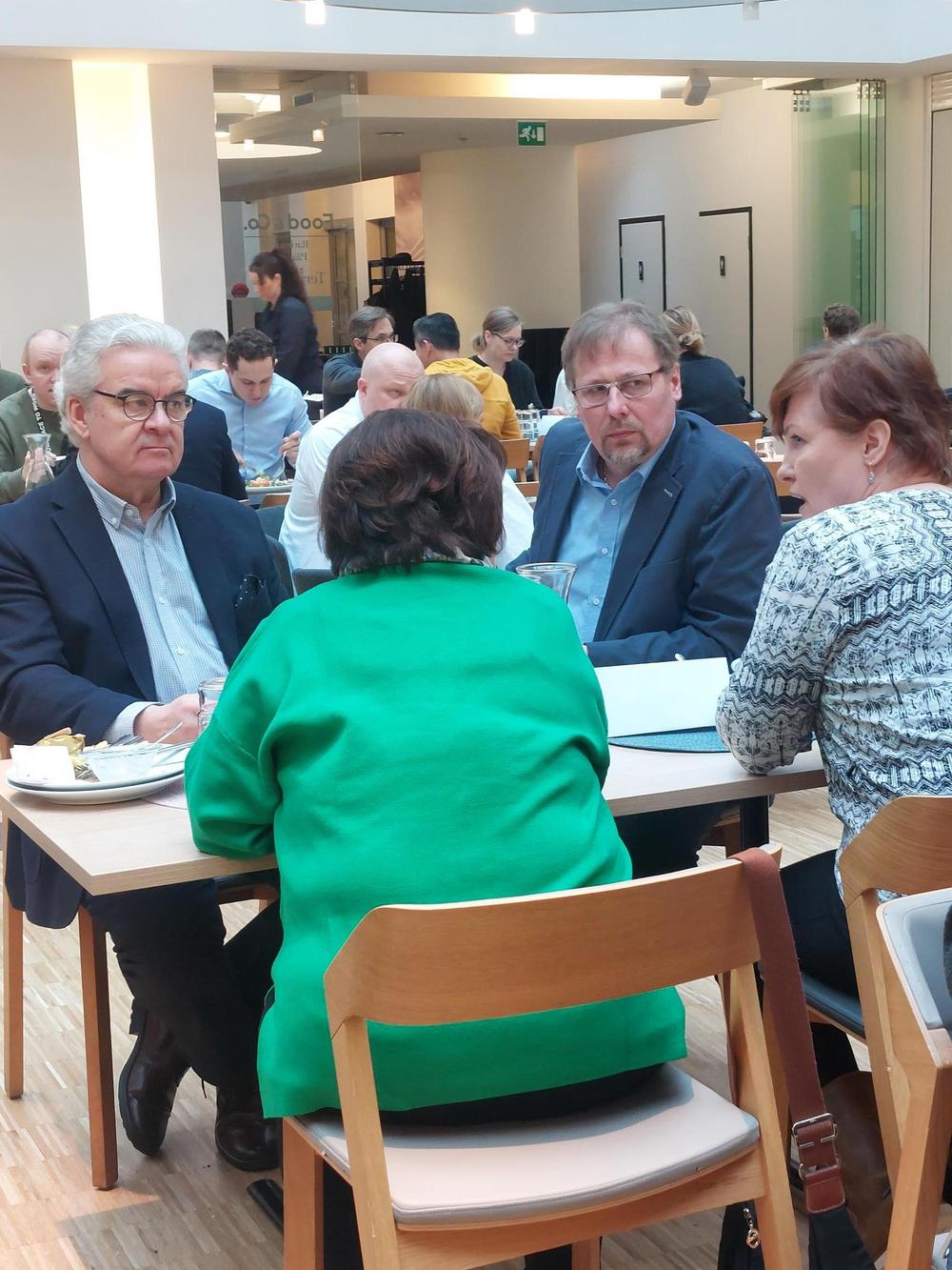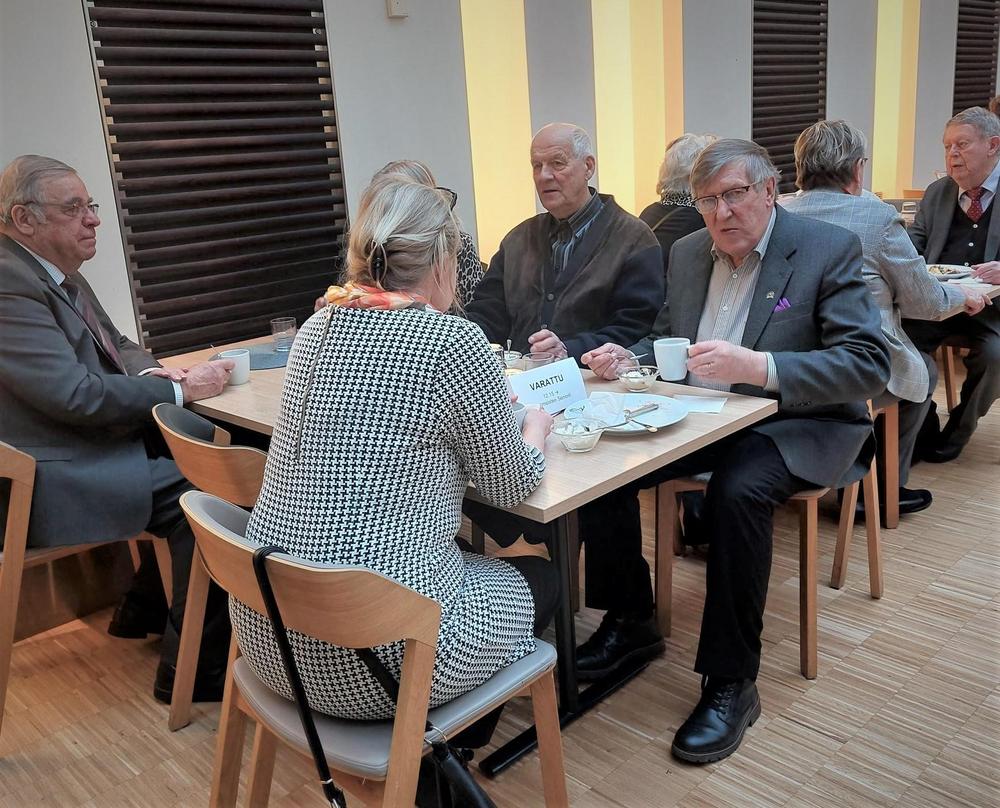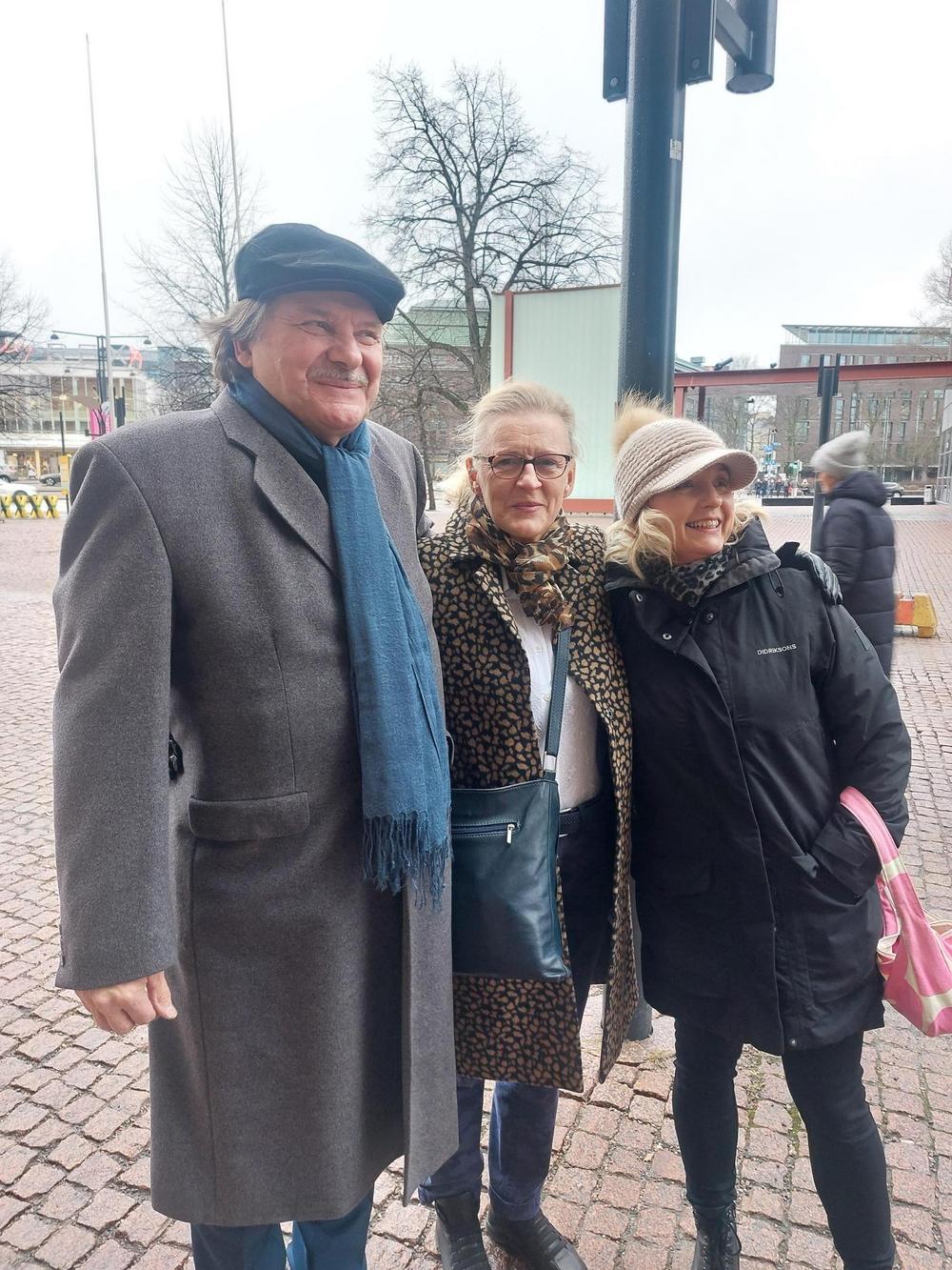 Kuhmoisten Seniorit ry.n puheenjohtaja Satu Harmainen, Eduskuntaan kutsujana toiminut kansanedustaja Arto Satonen ja Martti Kankkunen yhteiskuvassa.