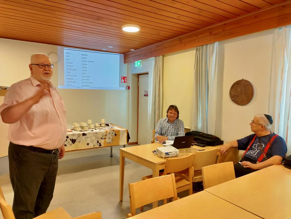 Meillä oli tänään 9.5 tosi mukava ja monipuolinen kielikylpy (Espanja, Italia, Saksa, Ruotsi, Heprea, Venäjä, Ranska, Englanti). Juhani on toiminut monissa yrityksissä kielenkääntäjänä, tulkkina ja kaiken lisäksi kielten opettajana Helsingissä useita vuosia. Hän on meille Senioreille erinomainen ulkomaisten kielten "varanto". Toivottavasti saamme tulevana syksynä aloitettua kielikerhoja Senioreiden keskuudessa. Lopuksi sihteerimme Väinö ojensi Juhanille kiitoslahjana puutarhaan perhosaiheisen lintujen juoma-astian sekä istutettavan Ruusun.
