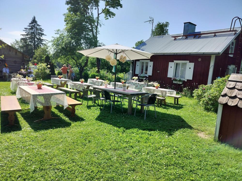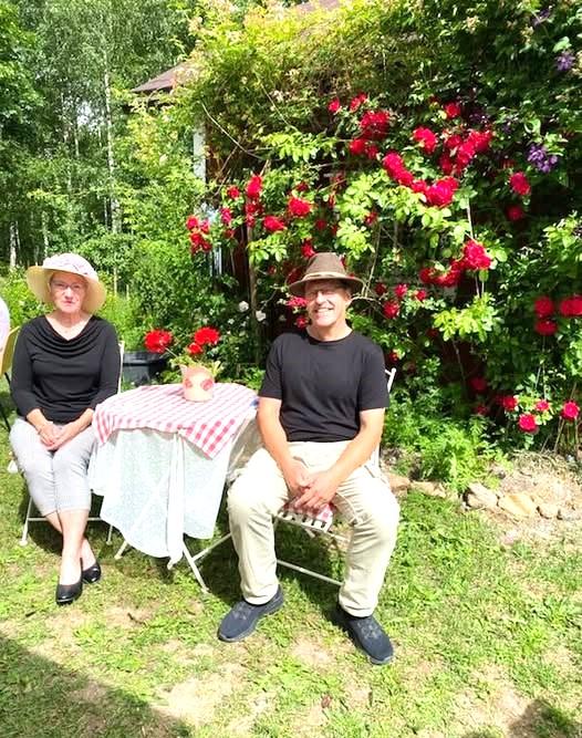 Ti 15.7. Hattujuhlat Allu ja Sirpa Räsäsen ruusupuutarhassa. (Harmoinen)